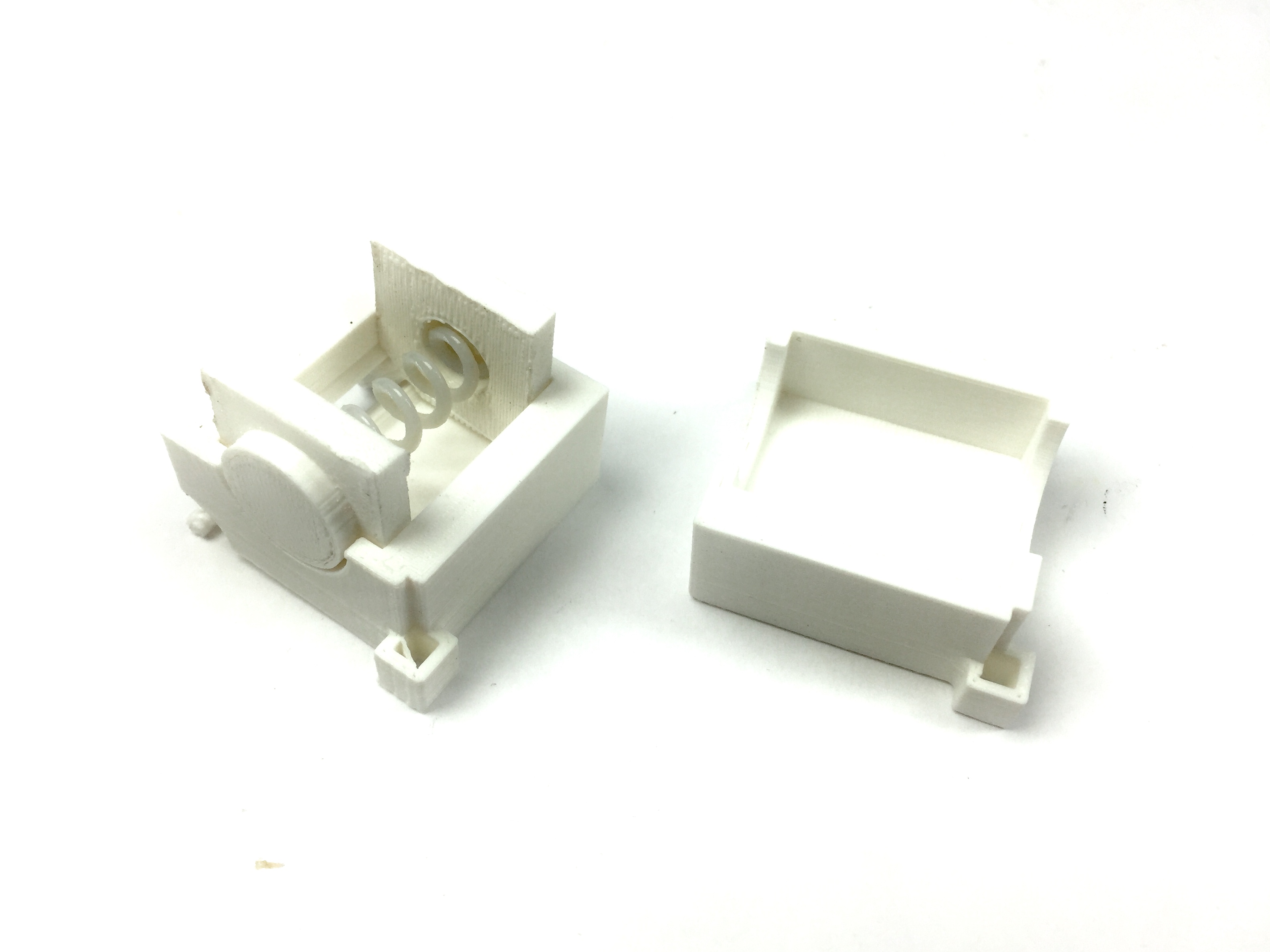 Testing began with simply printing my design on the Stratasys 3D printer. It had disolvable support material which allowed for the (ship in a bottle) design for the internal spring-and-button component.