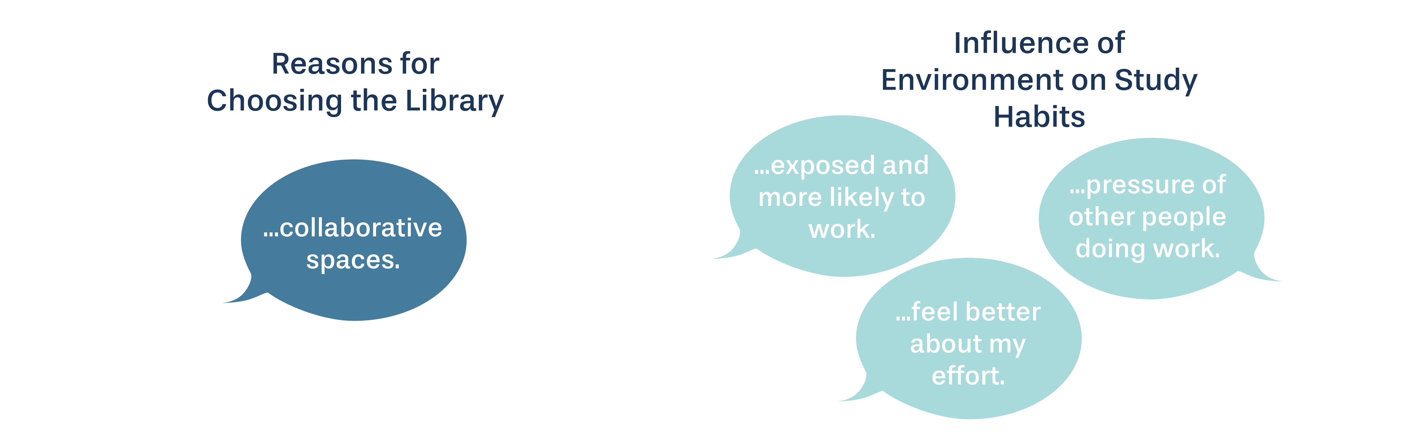 There was also indication that some people liked the available collaborative spaces and felt that the social pressure of working in the presence of others kept them accountable for their own work.