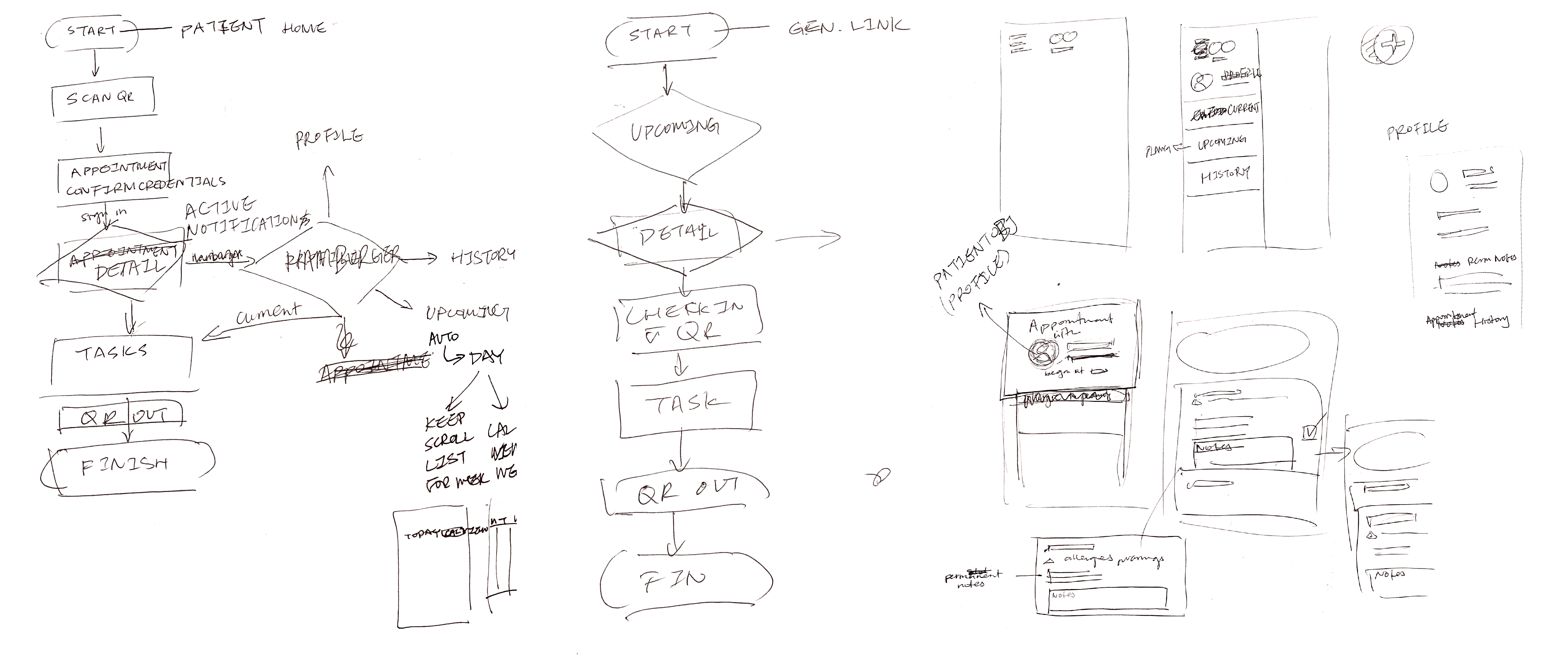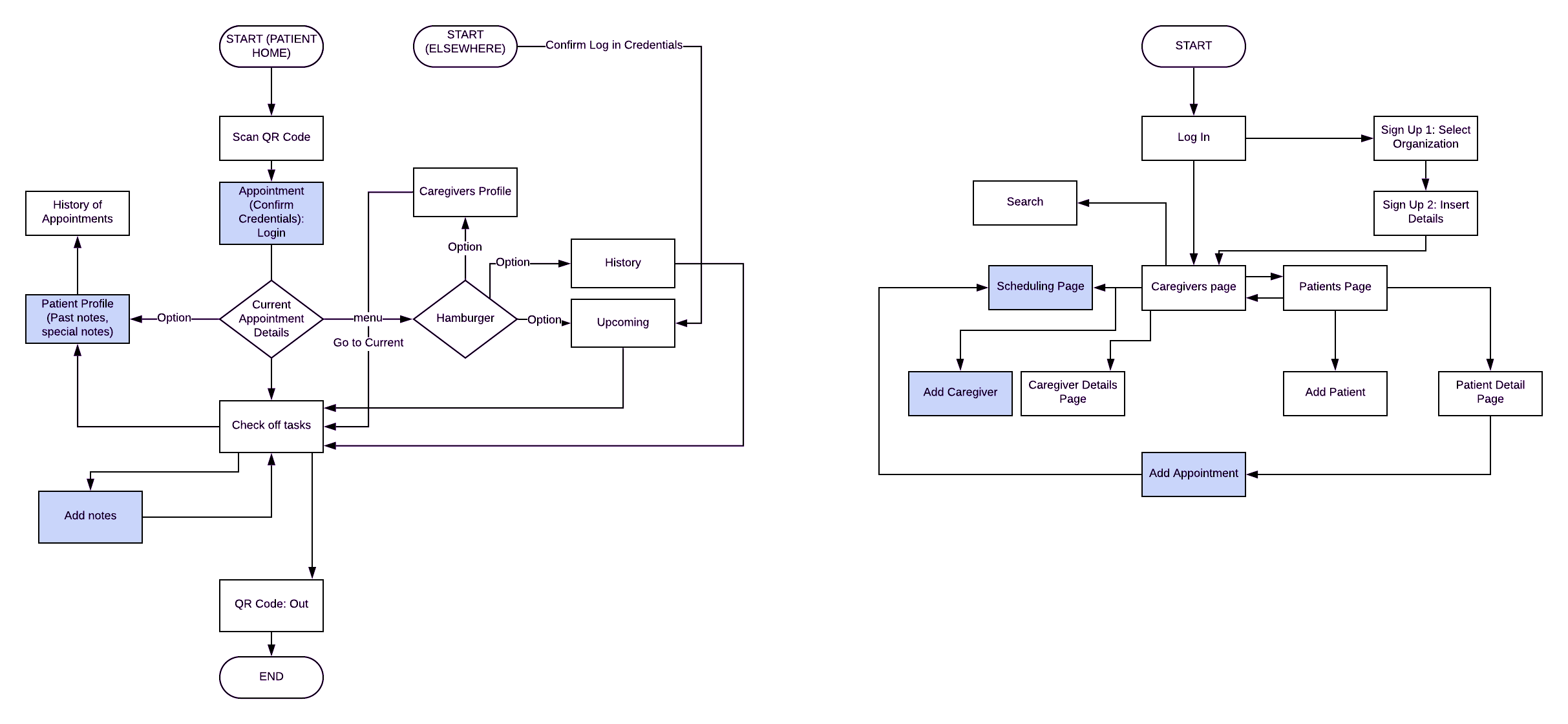 Carrying on from my previous conversation with Alex, we also realized that two access points were necessary on the caregiver side one from the QR check in at the patient's home and one from offsite so that caregivers can both gain direct access from the scan and can check on upcoming appointments and patient information offsite.