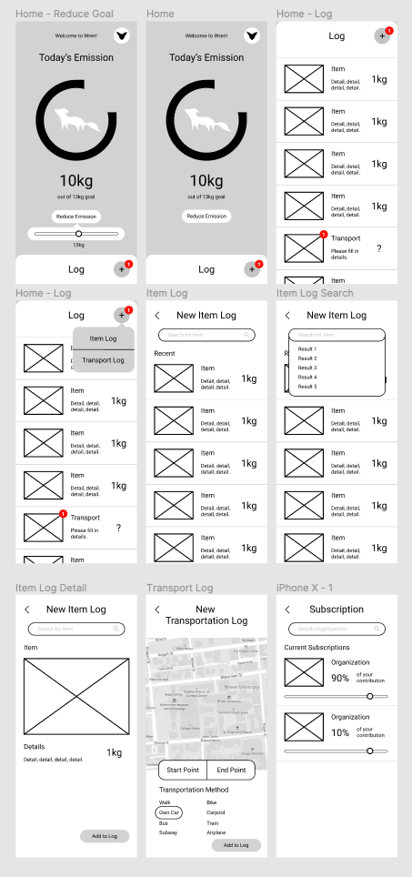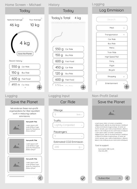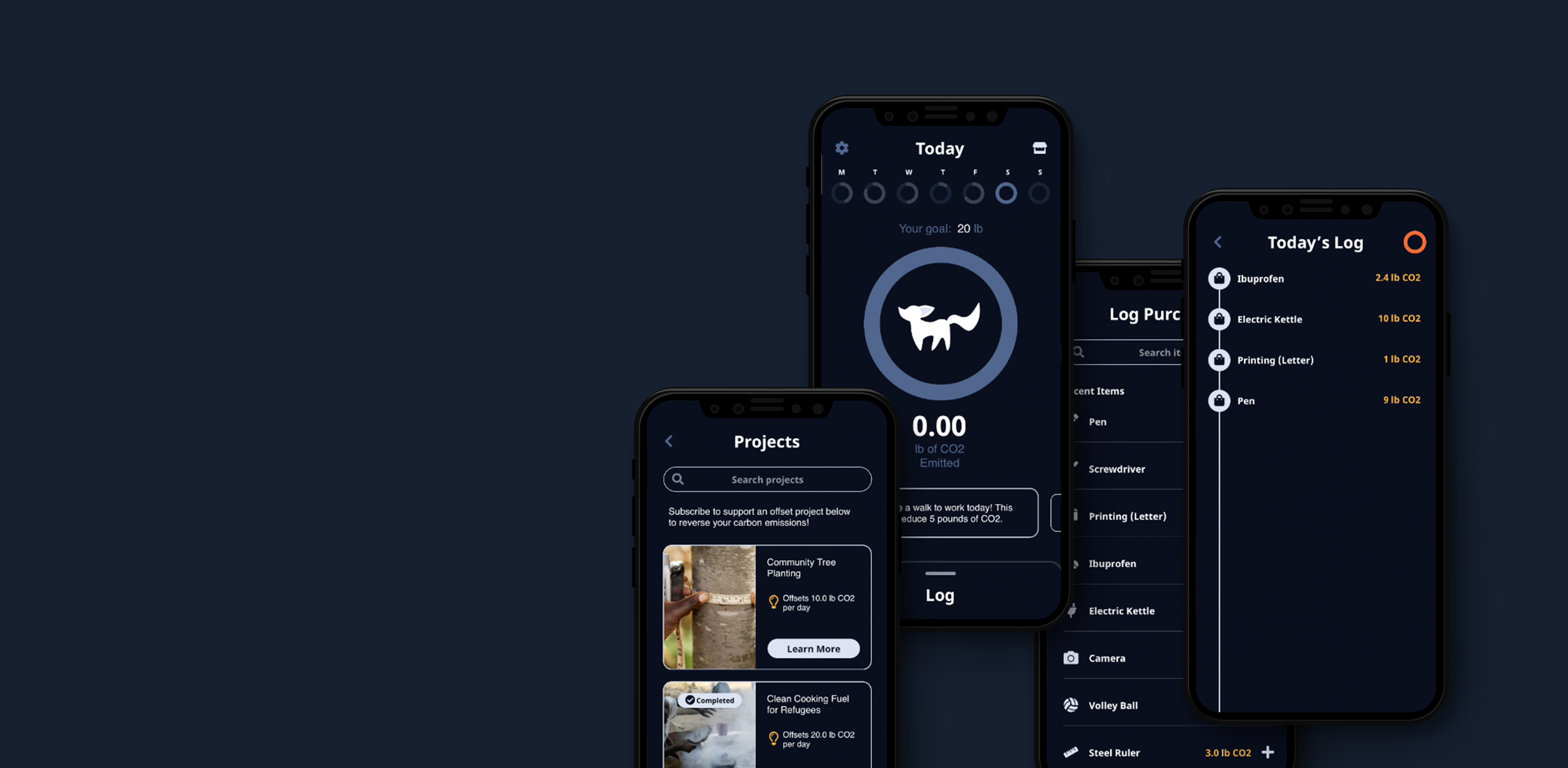 Taking the concept of this startup, we prototyped a mobile app that enables users to track the emissions of their purchases, view their emissions log, and subscribe to causes that offset their carbon footprint. We chose a mobile app because this allows users to carry the interface with them and reflect on their activity in real time.